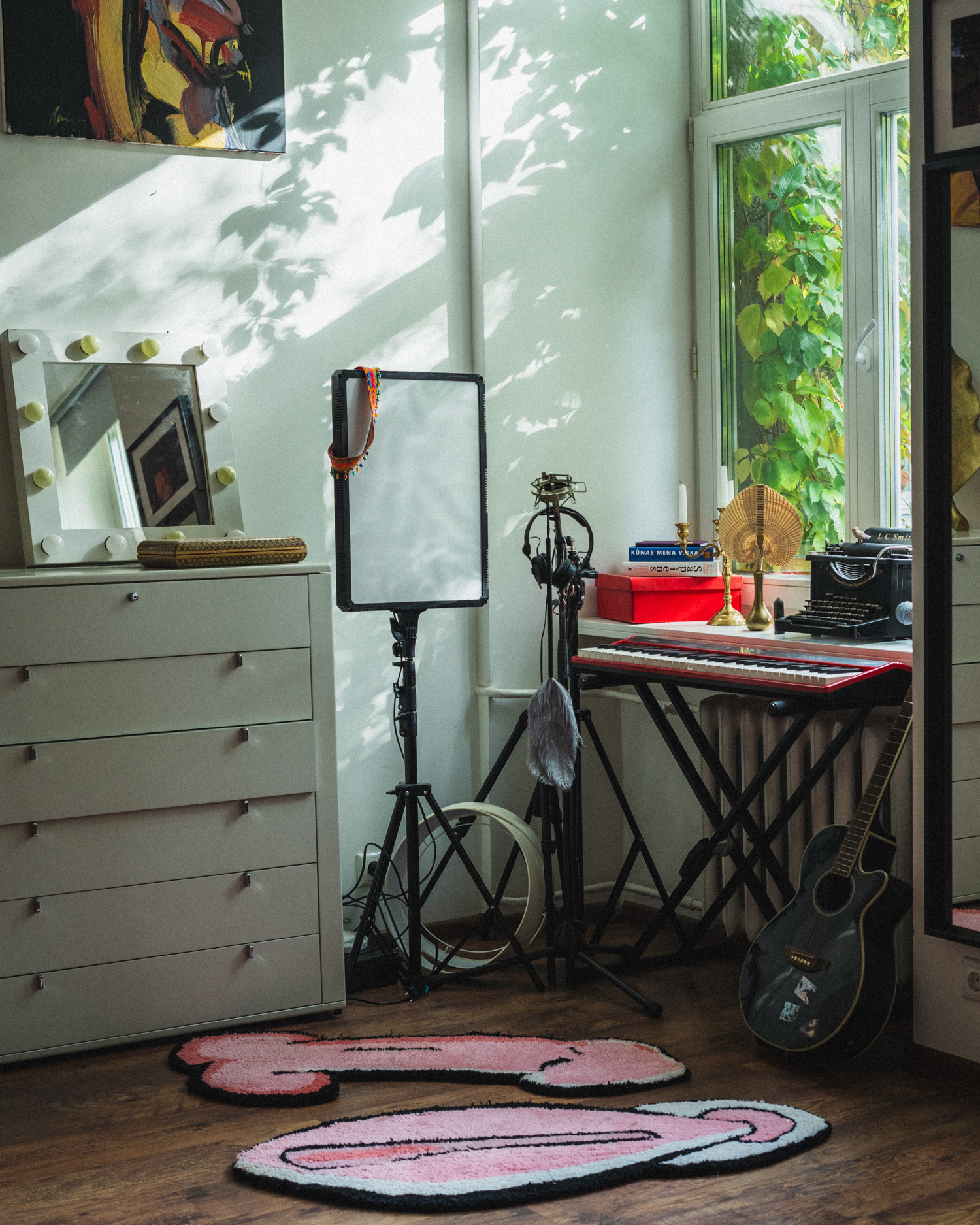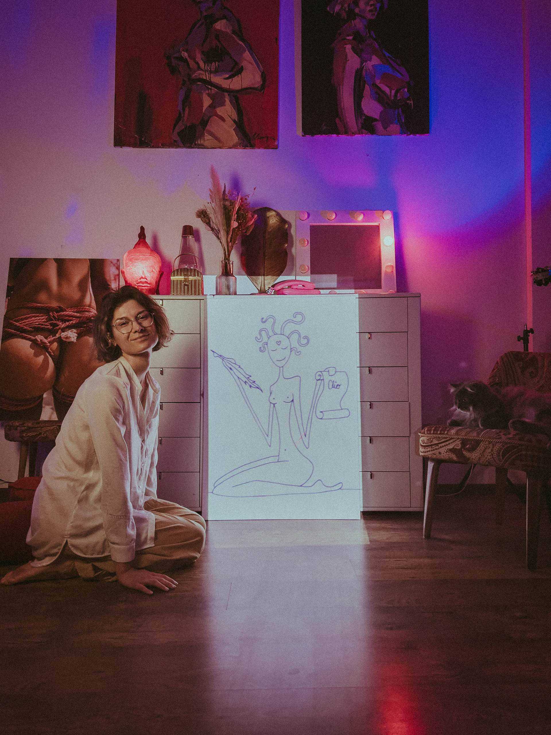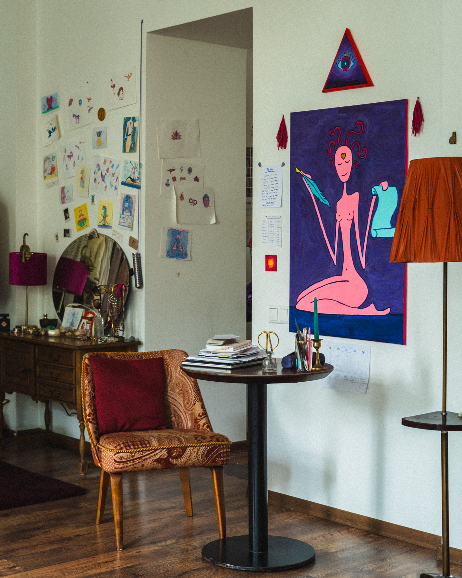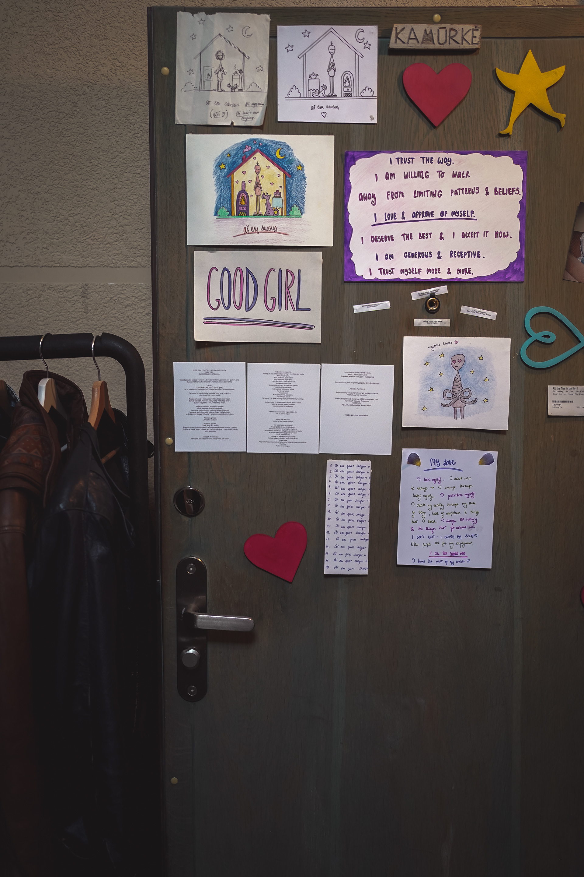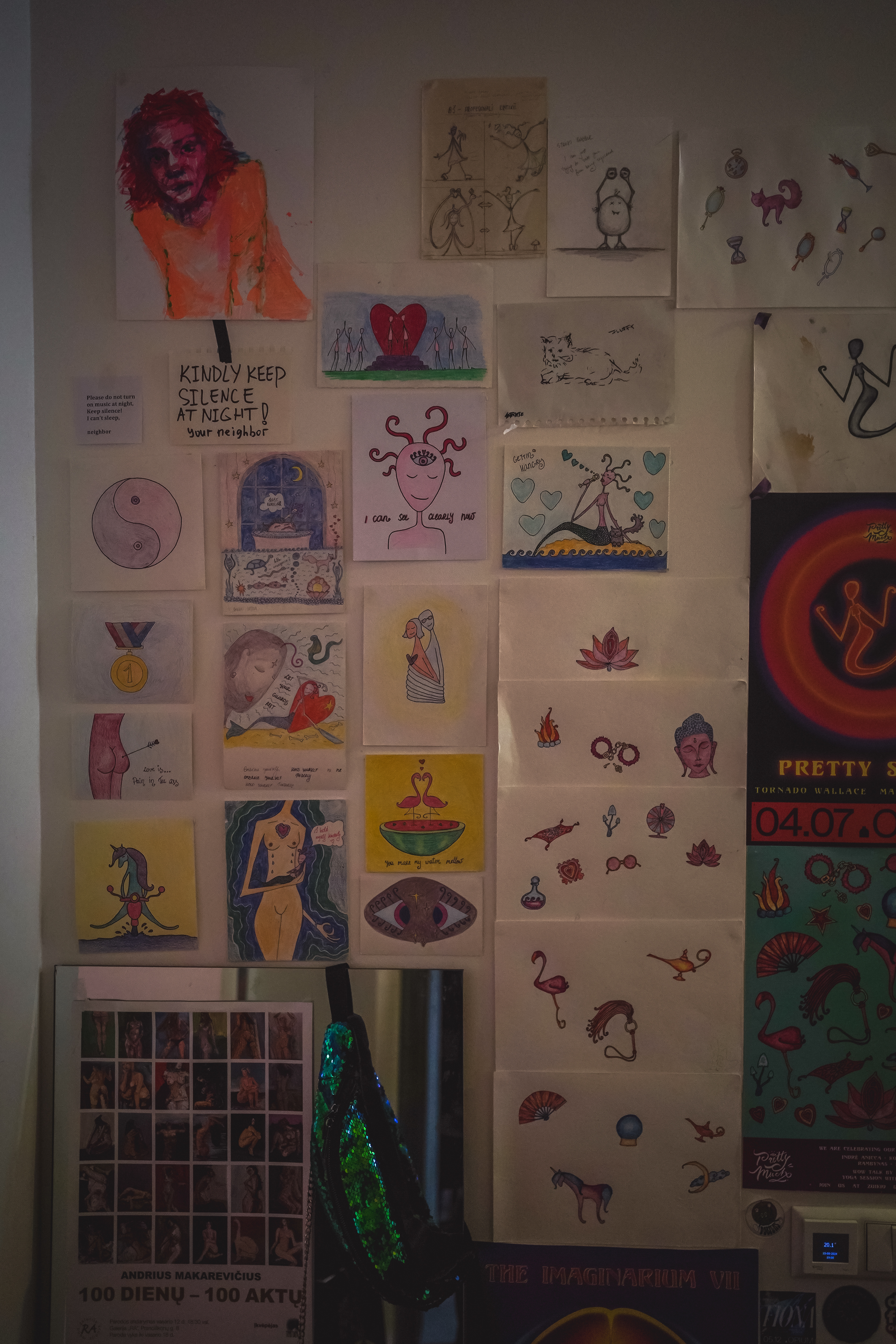 As Jovilė Sibilė was crashing into reality from Delulandia, her kindergarten friend welcomed her to settle into an apartment in Vilnius Old Town. The red sofa in the center of the room, overlooked by three paintings on the walls, became a cradle for a pivotal part of her inner healing journey. Through photography, painting, music, and the play of words, she embarked on a personal quest, unlocking hidden layers of her psyche – leaving hardly a clear wall in sight.