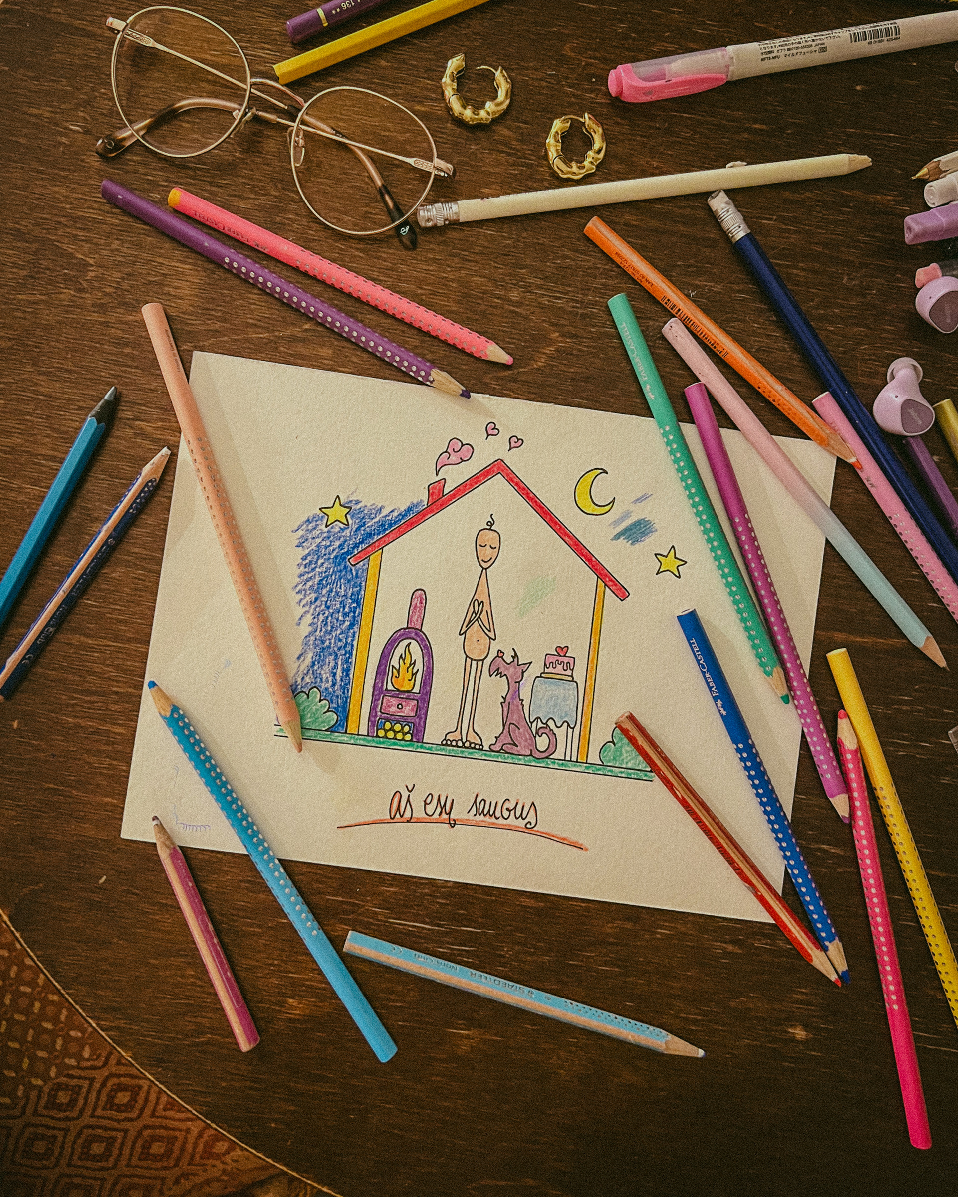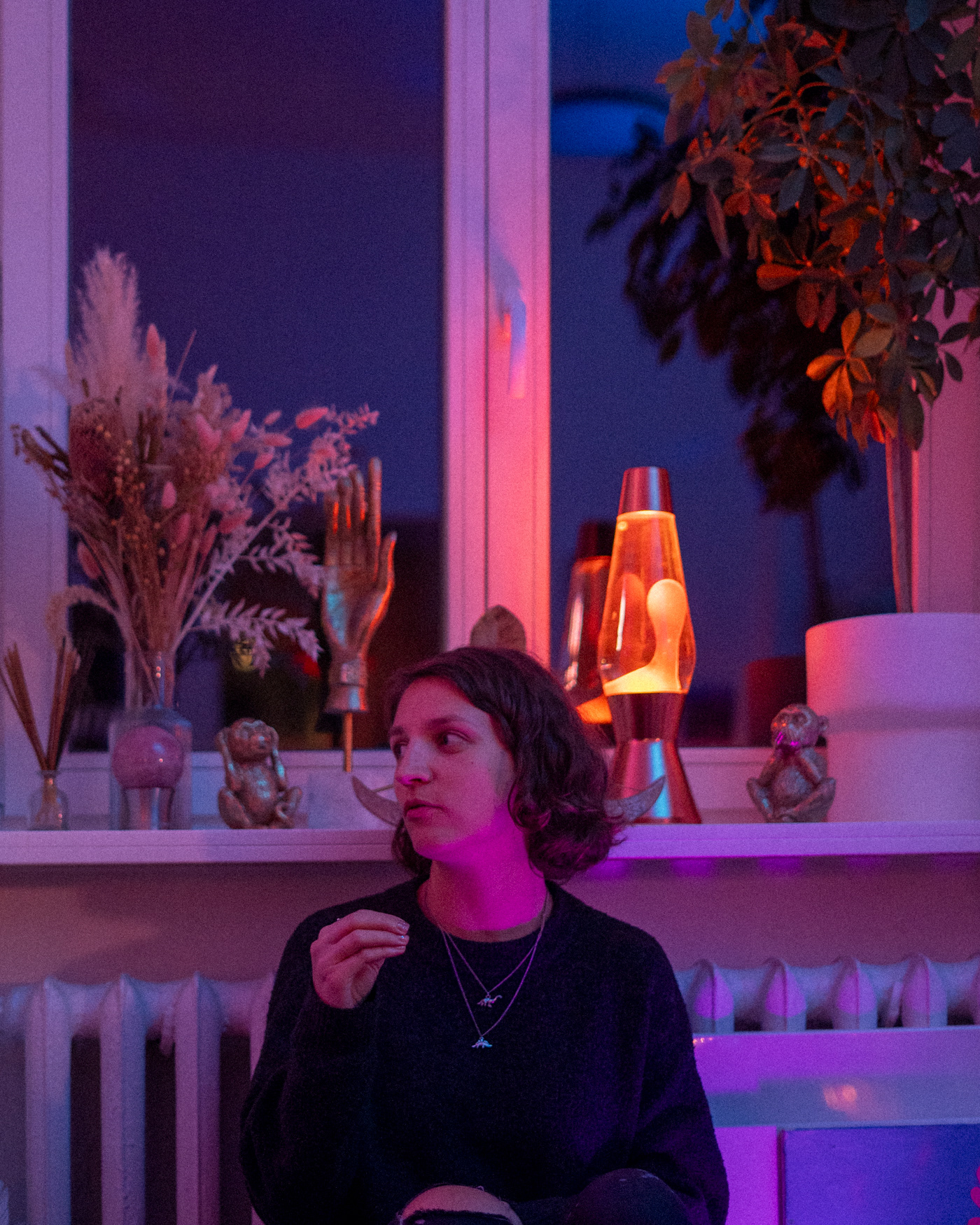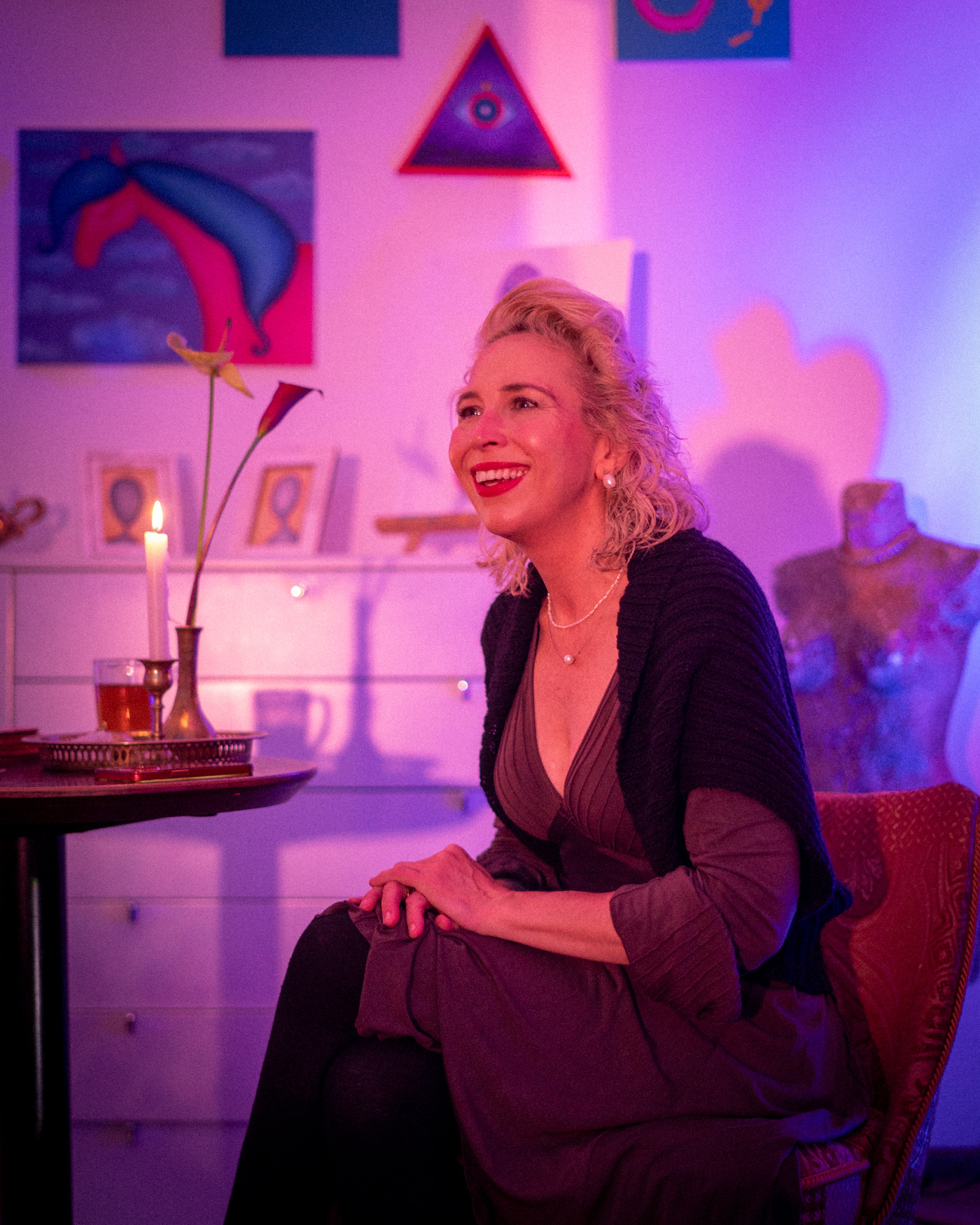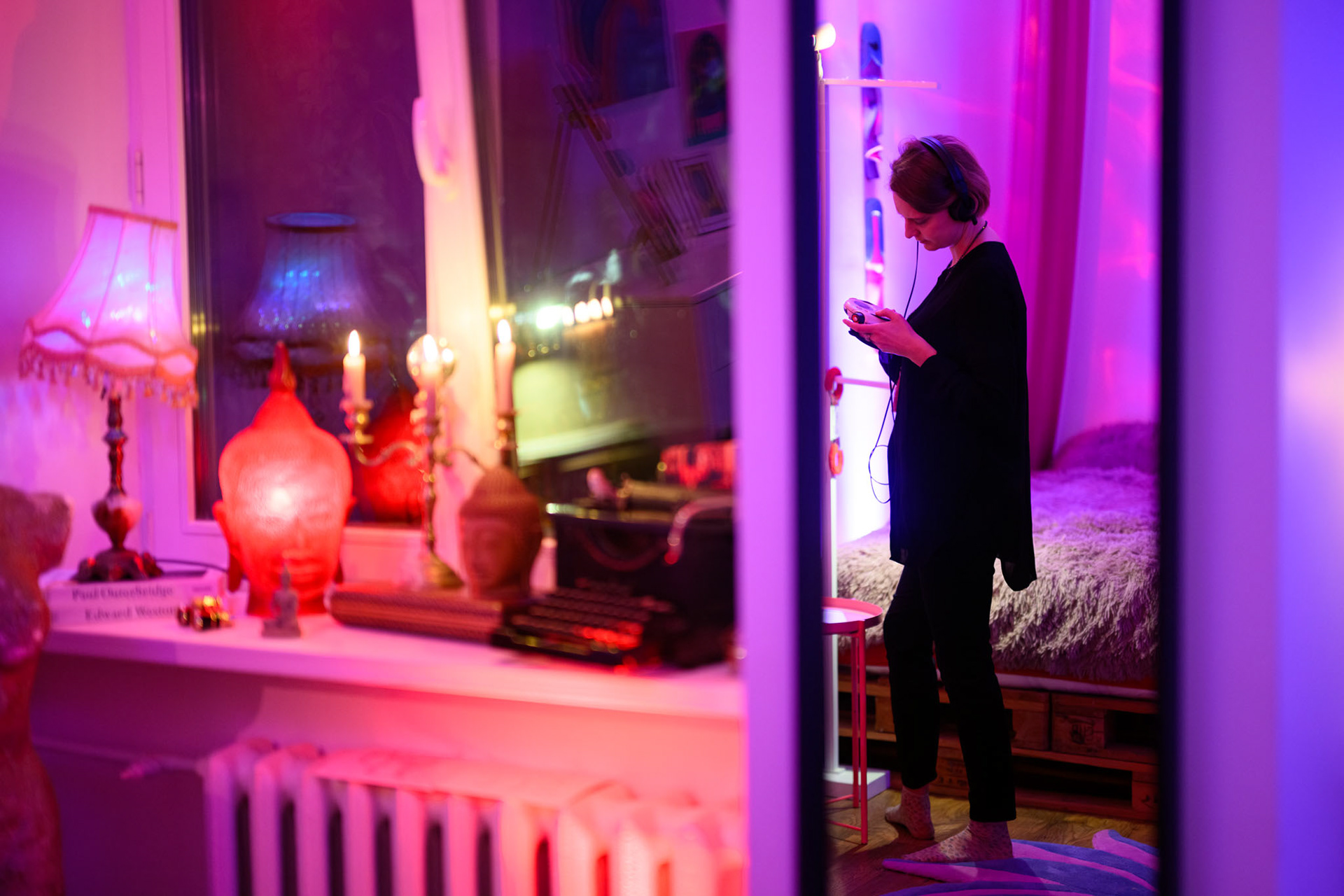 As Jovilė Sibilė was crashing into reality from Delulandia, her kindergarten friend welcomed her to settle into an apartment in Vilnius Old Town. The red sofa in the center of the room, overlooked by three paintings on the walls, became a cradle for a pivotal part of her inner healing journey. Through photography, painting, music, and the play of words, she embarked on a personal quest, unlocking hidden layers of her psyche – leaving hardly a clear wall in sight.